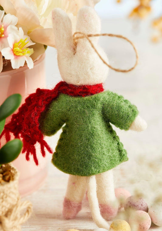 Felt Bunny In Green Dress And Red Scarf - Christmas Tree Decoration